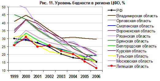 Липецкая область отличается менее сильным неравенством по доходу: отношение доходов крайних децильных групп составляло в 2006 г. 11,7 раз, что сопоставимо с половиной областей ЦФО, но существенно ниже среднероссийского неравенства (15,3 раз). По этой причине, а также благодаря невысокому прожиточному минимуму (среди регионов ЦФО он ниже только в Орловской области) уровень бедности в Липецкой области оказался самым низким в ЦФО и одним из наименьших в стране – 11,3% в 2006 г. (рис. 11). Область также имеет наилучшее в ЦФО отношение пенсий к прожиточному минимуму пенсионера – 130% (в среднем по РФ – менее 104%). Заниженный прожиточный минимум связан с тем, что область в 2006 г. не перешла на новую методику его расчета, которая делает показатель дороже на 10-15%. В результате благополучная статистика не вполне отражает реальную остроту проблем.