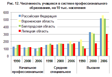 Профессиональное образование имело разные тенденции. Сеть начальных профессиональных учебных заведений сократилась почти на 20%, а количество средних специальных учебных заведений сохранилось почти полностью (рис. 12). Область никогда не отличалась высоким уровнем развития высшего образования, в советский период основные вузы были ориентированы на отрасли специализации — металлургию и АПК. Другие направления, платежеспособный спрос на которые не могли удовлетворить местные институты, стали в переходный период «осваивать» филиалы столичных вузов и вузов соседних регионов, но качество обучения в них еще более низкое. Несмотря на развитие филиальной сети, по числу студентов вузов (302 на 10 тыс. жителей) Липецкая область по-прежнему отстает от большинства областей ЦФО и среднего показателя по РФ (514).