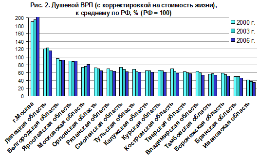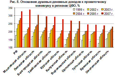 Социально-экономическое положение домохозяйств. Номинальные среднедушевые денежные доходы населения области почти на четверть ниже среднероссийских, но в ЦФО они отстают только от Москвы (в 3,9 раз) и Московской области (в 1,4 раз). По покупательной способности доходов, измеряемой отношением душевых доходов к прожиточному минимуму, который в области невысок, область еще более выгодно отличается от других регионов Черноземья и не так сильно уступает Московской области (рис. 8).