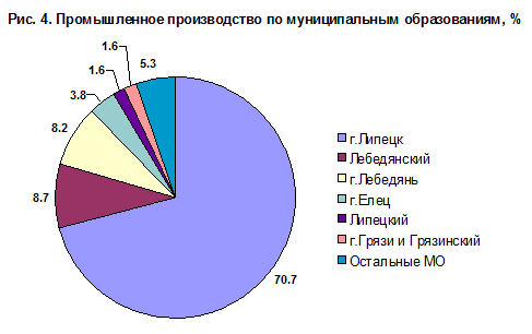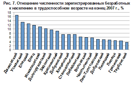 Данные по уровню зарегистрированной безработицы для муниципалитетов не публикуются, поэтому можно только косвенно оценить различия, сопоставив численность безработных и население в трудоспособном возрасте (рис. 7). Наиболее проблемными являются периферийные районы (Данковский, Усманский) и города с высокой долей отраслей, наиболее пострадавших в период кризиса, прежде всего машиностроения (Елец). В лучшем положении находятся муниципальные образования с более высокой долей отраслей АПК, а также районы, власти которых стимулируют приток инвестиций путем создания особых экономических зон разного типа (Тербунский, Лев-Толстовский, Лебедянский).