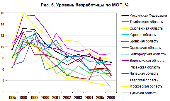По уровню безработицы (измеряемой по методологии МОТ) Липецкая область была одним из наиболее благополучных регионов страны, однако в 2005 г. произошел труднообъяснимый рост показателя вдвое – с 4 до 8%, а в 2006 г. он вновь вернулся почти к исходному уровню (4,9% при средней по стране безработице 7,2%). Резкие колебания уровня безработицы могут объясняться дефектами областной выборки при проведении выборочного обследования рынка труда, по данным которого рассчитываются показатели занятости. При этом зарегистрированная безработица сохранялась на очень низком уровне (0,8% при среднероссийском показателе 2,6-2,3%). РВ целом Липецкая область относится к группе наиболее благополучных регионов ЦФО по уровню занятости (рис. 6). Во всех регионах с более старой возрастной структурой населения смягчению ситуации на рынке труда и высвобождению вакансий способствует выход на пенсию многочисленных занятых старших возрастов.