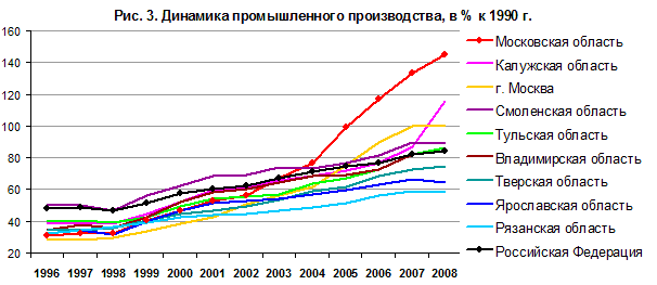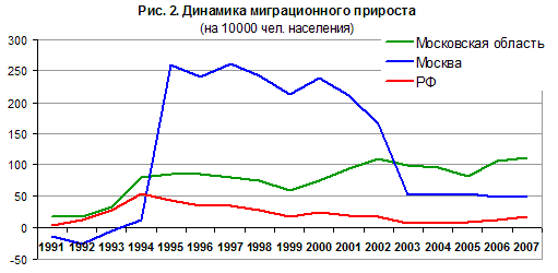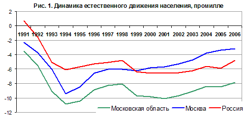 Демография. В советское время демографическая ситуация в области была более благоприятной по сравнению с остальными регионами Центра, т.к. постарение населения замедлялось многолетним притоком молодых мигрантов. В результате естественная убыль населения была впервые зафиксирована только в 1989 г., на одно-два десятилетия позже, чем в соседних регионах. В переходный период Подмосковье перестало отличаться от соседей, для него характерны постарение населения, низкая рождаемость и высокая смертность, за исключением небольшого числа муниципалитетов. С 2002 г. естественная убыль населения, как и по стране в целом, стала сокращаться, хотя и превышает значения начала 1990-х гг. более чем в 2 раза. При этом в столице падение естественного прироста в первой половине 1990-х гг. было еще более глубоким, чем в области, но с началом 2000-х гг. показатели стали улучшаться быстрее (рис. 1).
