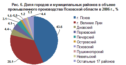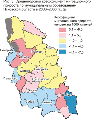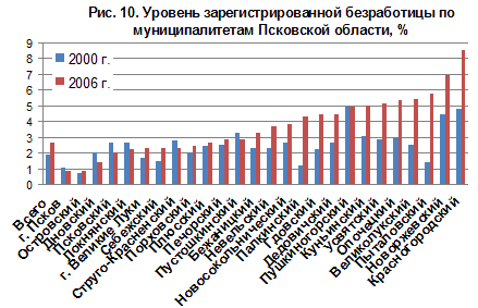 Зарегистрированная безработица втрое ниже, в начале 2008 г. ее уровень опустился до 1,9%, но за первые полгода кризиса (к апрелю 2009 г.) вырос вдвое – до 3,8%, превысив средний по стране (3,5%). Это не самый высокий показатель на Северо-Западе, проблемы рынка труда Калининградской и Вологодской областей острее (4,5-4,8%) Последние муниципальные данные есть только за 2006 г., они подтверждают центро-периферийные различия локальных рынков труда. Минимальный уровень безработицы отмечался в областном центре и его пригородном районе, в крупных городах – Великих Луках и Острове, а также в железнодорожных узлах (рис. 10). В некоторых районах низкие показатели объясняются преобладанием в населении старших возрастов, что смягчает напряженность на рынке труда. Максимальный уровень зарегистрированной безработицы -- в периферийных и глубинных районах, а также в моноспециализированных городах с одним-двум предприятиями находящихся в кризисе отраслей (льно-, молокозаводами, деревообработкой).