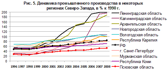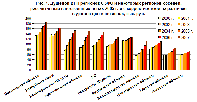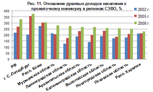 Социально-экономическое положение домохозяйств. В последние годы экономического роста депрессивность экономики области уже не так сильно отражалась на доходах населения благодаря возросшим федеральным трансфертам. Неравенство населения по доходу удавалось частично сглаживать даже при сильном экономическом неравенстве регионов. По соотношению денежных доходов и прожиточного минимума область близка к другим регионам среднеразвитым регионам, опережая на Северо-Западе лишь Карелию, где прожиточный минимум заметно выше. За последние шесть лет это соотношение выросло, однако не так существенно, как в среднем по стране и в большинстве более развитых регионов, поскольку перераспределение федеральных средств не могло компенсировать пониженные темпы роста местной экономики (рис. 11).
