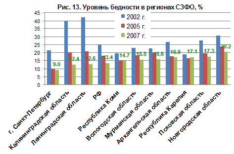 | | Рис. 13. Уровень бедности в регионах СЗФО, % |