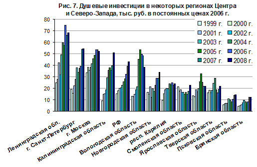 Из-за относительно низких заработков в области заметно ниже и неравенство по доходу. Коэффициент фондов (отношение доходов 10% населения с максимальными и минимальными доходами) составлял в 2007 г. 11 раз (в среднем по РФ – почти 17 раз), это самый низкий показатель на Северо-Западе. О невысоких доходах населения свидетельствует структура расходов домашних хозяйств, в ней повышена доля расходов на покупку продовольствия и товаров первой необходимости и понижена доля услуг и сбережений. По уровню бедности Псковская область входит в число наиболее проблемных регионов, хотя за последние годы в результате перераспределительной федеральной политики различия между большинством регионов Нечерноземья сильно сгладились (рис. 13). Но экономика области, не успев выйти из прошлого кризиса, уже вошла в новый, поэтому рост уровня бедности в 2009 г. неизбежен.