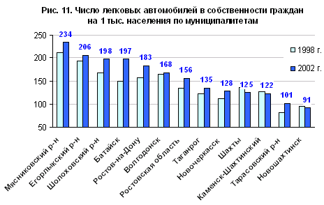 Аутсайдерами по обоим косвенным показателям являются депрессивные угледобывающие города и прилегающие к ним районы (Шахты, Каменск-Шахтинский, Новошахтинск, Гуково, Миллеровский, Тарасовский районы), расположенные на севере области. Обеспеченность автомобилями в угольных городах почти на треть ниже средней по области и даже сократилась за годы экономического роста, что говорит о степени депрессивности. Немногим лучше показатели городов с машиностроительной специализацией — Азова, Таганрога, Новочеркасска. Последние два города относятся к крупным (с населением 170–280 тыс. человек), но в них так и не сформировались альтернативные источники занятости и доходов на базе развитой торговли и других отраслей сектора услуг. Дело в том, что Ростов-на-Дону, как и Москва в Центральной России, подавляет окружающие города, стягивая все доходные сервисные функции на себя.
