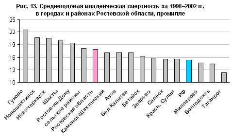 Рис. 13. Среднегодовая младенческая смертность за 1998–2002 гг. в городах и районах Ростовской области