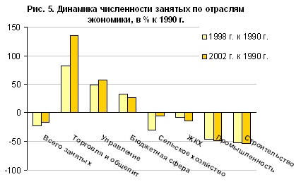 Занятость и рынок труда. Уровень экономической активности населения Ростовской области и в советское время, и в переходный период был ниже среднего по стране. В 2002 г. 62% населения относилось к экономически активному, в среднем по России — 65%. Пониженной активностью отличаются все регионы Северного Кавказа, так как в них выше доля сельского населения и занятость в личном подсобном хозяйстве. По динамике занятости Ростовская область схожа со среднероссийским трендом: численность занятых сокращалась до 1998 г., а после дефолта начался ее рост. В отраслевом разрезе максимальное сокращение произошло в промышленности и строительстве, наиболее сильный рост — в торговле, выросла также занятость в управлении и бюджетной сфере (рис. 5). Специфична только динамика занятости в сельском хозяйстве: если в большинстве регионов Юга она непрерывно росла, аккумулируя мигрантов, то в Ростовской области рост возобновился только после дефолта, а в середине 1990-х годов занятость в агросекторе сокращалась. Вероятно, это связано с более сильным оттоком занятых из сельского хозяйства в другие отрасли экономики и личное подсобное хозяйство (ЛПХ) в наихудшие для сельского хозяйства годы.