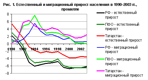 Все города, за исключением экономически депрессивного Чистополя, в 1989–2004 гг. сохранили положительную динамику населения (табл. 1). В столице республики, в 2005 г. отмечающей свое символическое 1000-летие, прирост минимален и на перспективу может сохраниться за счет административных преобразований (по новому генплану намечено значительное расширение городской черты). В число городов, имеющих наибольшие темпы роста, входят не только большие, но малые и средние города, растущие во многом за счет окружающей сельской местности. В республике еще не завершился процесс урбанизации, который был заторможен кризисом 1990-х годов, и рост городов продолжают подпитывать миграции из села.