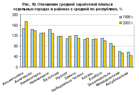 Однако ту степень выравнивания, которую удается сохранить по отраслям, все труднее поддерживать по территории республики. Несмотря на декларируемую в Татарстане политику выравнивания, внутриреспубликанская дифференциация по уровню реальной зарплаты нарастает. Это показывают расчеты отношения заработной платы в муниципалитетах к среднереспубликанской за 1998 и 2003 гг. (рис. 10). Безусловным лидером, увеличивающим отрыв от остальных муниципалитетов, остается нефтедобывающий Альметьевск, за которым выстроились другие нефтедобывающие центры. Нефтехимический Нижнекамск и энергетический Заинск стали утрачивать свое преимущество в заработках. В двух крупнейших городах республики — Казани и Набережных Челнах — средняя заработная плата выросла относительно средней по Татарстану, так как все крупные города страны в переходный период наращивали преимущество в доходах. Но для Казани и Нижнекамска политика выравнивания сказывается — хотя заработки жителей растут быстрее, они ненамного выше средних по республике. Машиностроительные города Елабуга и особенно Зеленодольск за годы экономического роста явно ухудшили свои позиции по уровню заработной платы, она росла медленней среднереспубликанской.