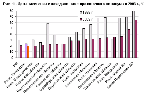 Более устойчивое экономическое положение в сочетании с политикой выравнивания доходов позволяло Татарстану в конце 1990-х годов сохранять более низкий уровень бедности как на фоне России (24 и 30% в 1999 г.), так и по сравнению с подавляющим большинством регионов ПФО, за исключением сильных соседей — Самарской и Пермской областей. По мере экономического роста и снижения показателей бедности в России преимущество республики стало таять, хотя она все еще намного опережает слабых соседей — не вышедшую из депрессивного состояния Ульяновскую область (36% в 2003 г.), республику Марий Эл (48%) и тем более Коми-Пермяцкий АО (64%). Доля бедных (населения с доходами ниже прожиточного минимума) в Татарстане (20%) близка к среднероссийской и только на 1–3 процентных пункта отличается от показателей сильных соседей — Пермской, Самарской и Нижегородской областей (рис. 11). При этом не стоит забывать, что стоимость жизни в Татарстане невысока, поэтому и черта бедности (прожиточный минимум) ниже, чем у всех регионов ПФО, за исключением слаборазвитой республики Марий Эл. Дополнительные проценты к уровню бедности в Татарстане добавляет более высокая доля сельского населения по сравнению с большинством развитых регионов ПФО. Но доверять официальным данным об уровне сельской бедности следует с большой осторожностью — те, кто бывал в татарских деревнях и видел недавно построенные или отремонтированные дома, обилие домашнего скота и интенсивно используемые земельные участки, понимает всю относительность измерений.