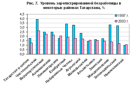 Уровень зарегистрированной безработицы невысок, даже в середине 1990-х гг. в наиболее кризисных районах республики он не превышал 4%. Более высокими показателями отличались города машиностроения — Чистополь, Елабуга, Набережные Челны, Зеленодольск, химии — Менделеевск, но экономический подъем снизил остроту проблем занятости в большинстве из них (рис. 7). В 2003 г. уровень зарегистрированной безработицы в Татарстане составлял только 1,3% (в РФ — 2,3%), относительно невелика ее средняя продолжительность — 5,5 месяцев. Однако, как и в среднем по стране, безработица в Татарстане с 2002 г. вновь начала расти. Проблемы концентрируются в монопрофильных городах, где ситуация на рынке труда зависит от экономического положения одного-двух основных предприятий. Это города Чистополь (ОАО Чистопольский часовой завод "Восток"), Лениногорск (нефтегазодобывающее предприятие "Татнефтебитум"), Елабуга (ПО "ЕлАЗ"), пгт Камские Поляны. Минимальным уровнем зарегистрированной безработицы отличаются центры нефтепереработки, нефтехимии и энергетики.
