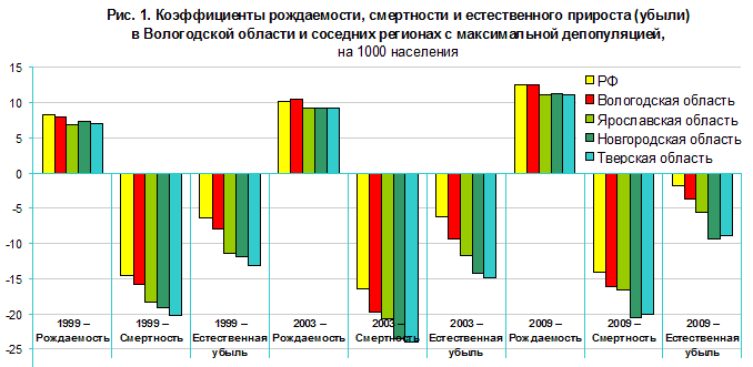 Демография. Численность населения области стала сокращаться несколько позже по сравнению с наиболее постаревшими соседними областями Нечерноземья — Новгородской, Тверской, Ярославской. До сих пор показатели рождаемости и естественной убыли в Вологодской области несколько лучше, чем в наиболее демографически кризисных регионах, и ближе к среднероссийским (рис. 1). Депопуляция характерна для всех муниципальных образований области, различается только ее глубина: в некоторых сельских районах смертность в 2,5 раза выше рождаемости, в Вологде и Череповце — в 1,2 раза.