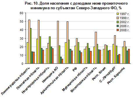 | | Рис. 10. Доля населения с доходами ниже прожиточного минимума по субъектам Северо-Западного ФО, % |