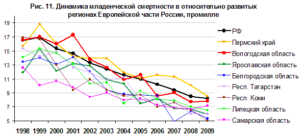 | | Рис. 11. Динамика младенческой смертности в относительно развитых регионах Европейской части России, промилле |