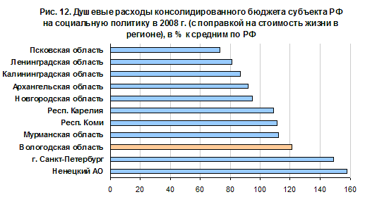 В структуре расходов бюджета Вологодской области на социальные цели приоритетное место занимают расходы на социальную политику. Душевые расходы на социальную политику (с учетом стоимости жизни) на 20% выше среднестрановых, на Северо-Западе область уступает только "богатому" Санкт-Петербургу и нефтяному Ненецкому АО (рис. 12). Несмотря на резкое снижение доходов консолидированного бюджета области за 2009 г. (-21%) из-за почти пятикратного сокращения поступлений налога на прибыль, ее расходы на социальную политику выросли на 16% (в среднем по регионам – на 26%).