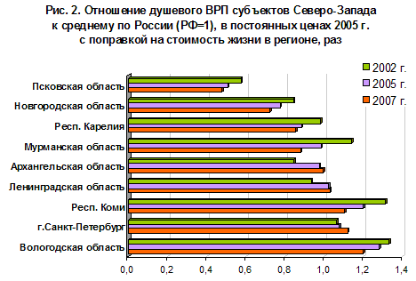 | Рис. 2. Отношение душевого ВРП субъектов Северо-Запада к среднему по России (РФ=1), в постоянных ценах 2005 г. с поправкой на стоимость жизни в регионе, раз |