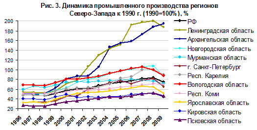 | | Рис. 3. Динамика промышленного производства регионов Северо-Запада к 1990 г. (1990=100%), % |
