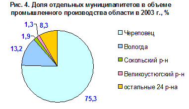 | | Рис. 4. Доля отдельных муниципалитетов в объеме промышленного производства области в 2003 г. |