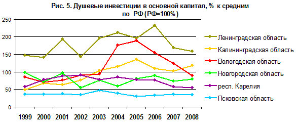 | | Рис. 5. Душевые инвестиции в основной капитал, % к средним по РФ (РФ=100%) |
