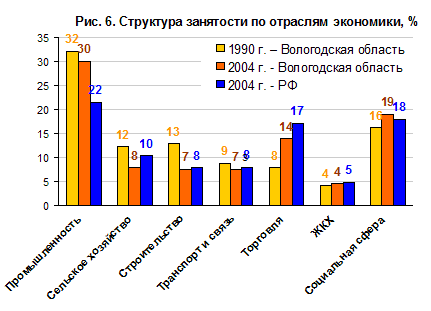 | | Рис. 6. Структура занятости по отраслям экономики (ОКОНХ), % |