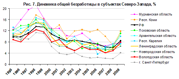 По сравнению с подавляющим большинством регионов Северо-Запада и страной в целом Вологодская область почти весь переходный период и в течение 2000-х гг. имела более низкий уровень общей безработицы, измеряемой по методологии МОТ (рис. 7). В 2007 г. он сократился до 4%, это один из самых низких показателей среди регионов России, за исключением федеральных городов и прилегающих к ним агломераций.