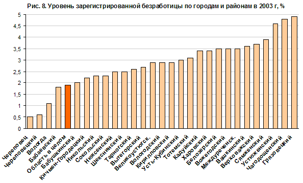 | | Рис. 8. Уровень зарегистрированной безработицы по городам и районам в 2003 г., % |