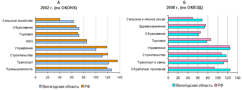 | Рис. 9. Отношение заработной платы по отраслям (2002 г.) и видам экономической деятельности (2008 г.) к средней по экономике в Вологодской области и по России в целом (среднее = 100), % |